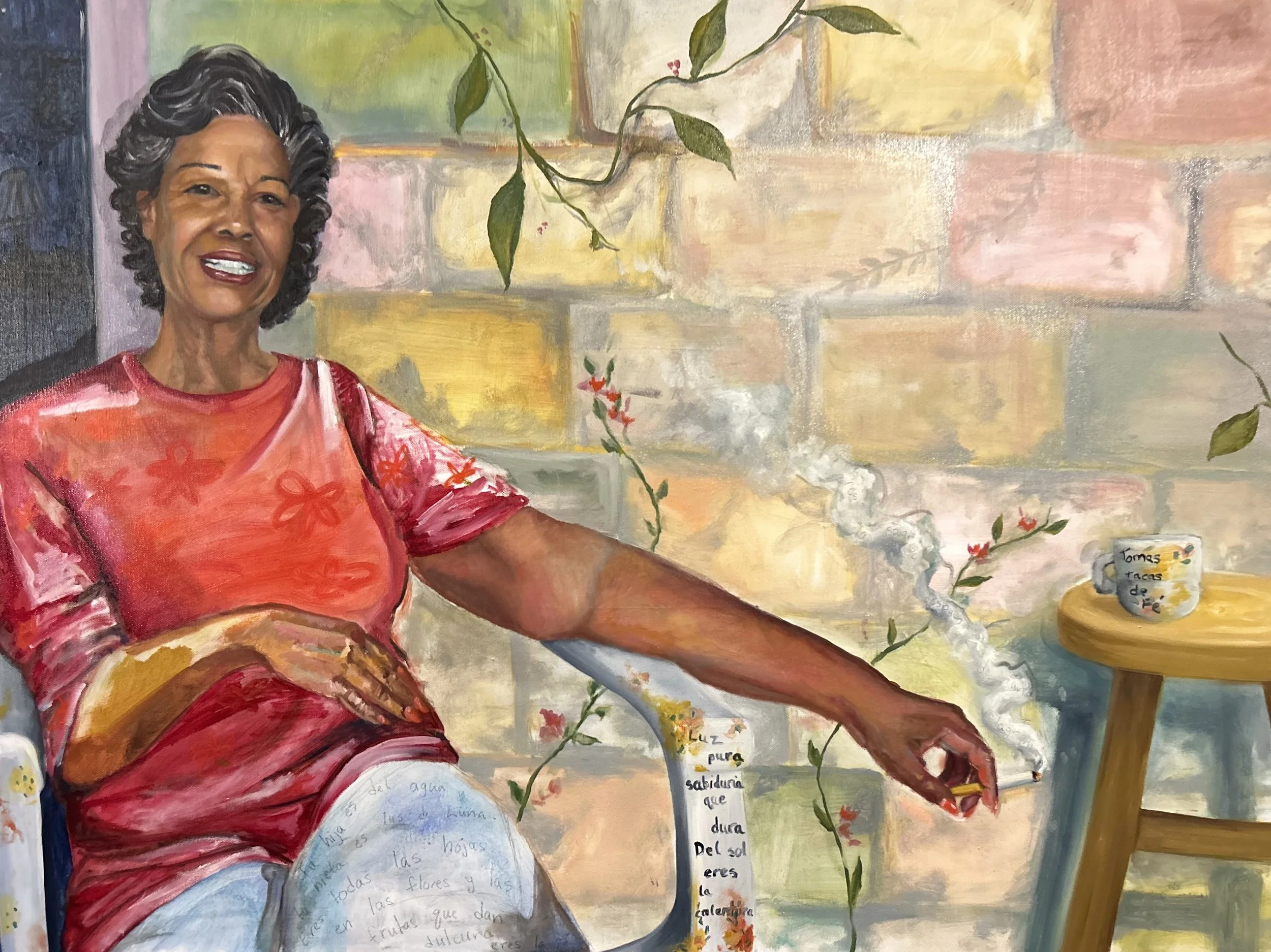 These scenes occupy spaces infused with poetry and magical realism, where domestic interiors, personalized decor, and imagined environments are infused with the complex emotions of the people who inhabit the spaces. These spaces carry generational baggage, habits, and emotional weight embedded into the objects touched by the figures in the scene. Poetry and image coexist, each holding fragments of memory, emotion, and presence. The written words appear as an imprint: something spoken, overheard, or left behind.